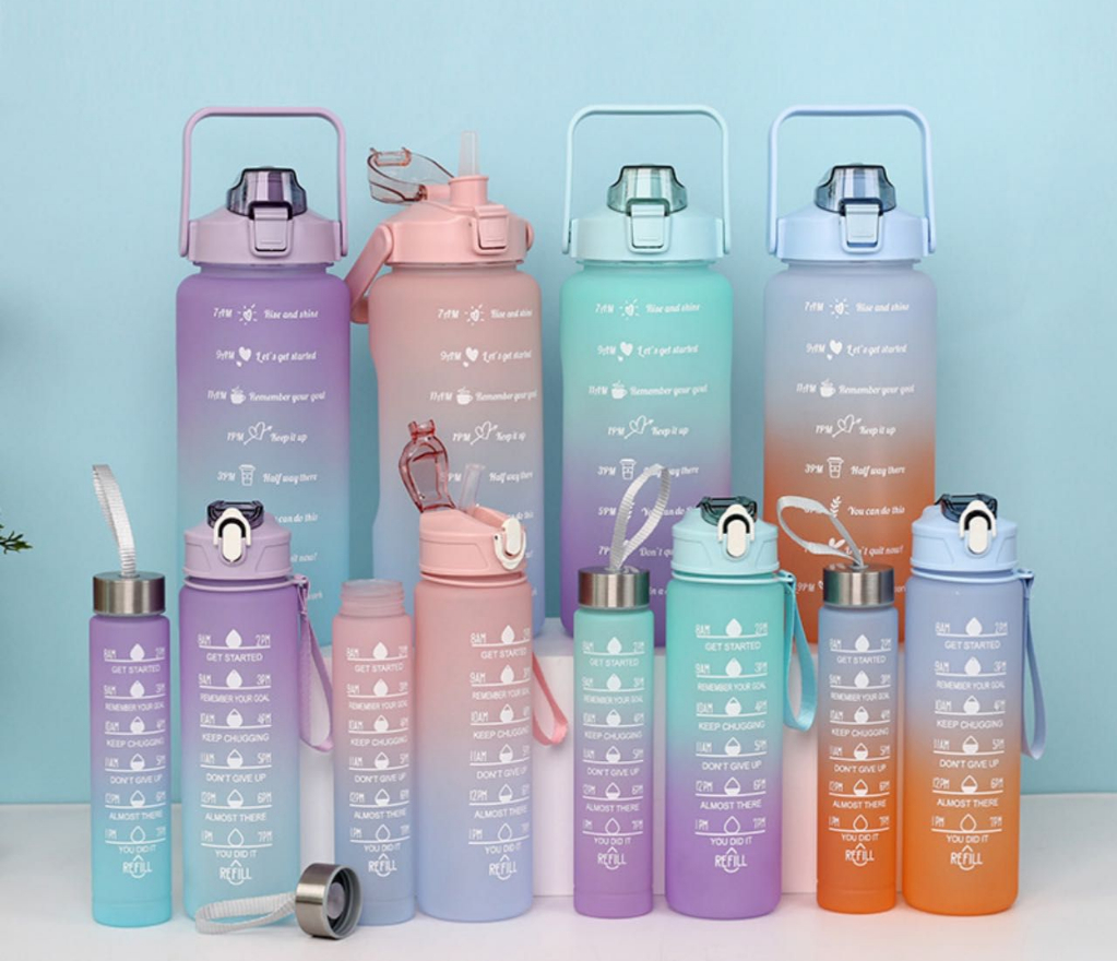 Marcadores de tempo e capacidade. Ótimo para medir sua ingestão diária de água, é visualmente bom ver você se aproximar de seu objetivo mais cedo.
